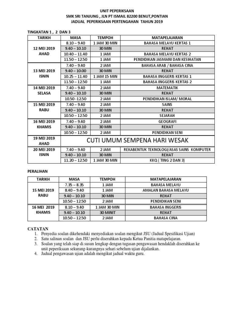 Jadual Peperiksaan Pertengahan Tahun Bagi Tingkatan 3 4 5 Smk Taman Sea