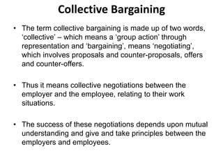 It is called collective because both the employer and the employee act as a group rather than as individual. To foster industrial democracy. Redesigning the machinery of bargaining.